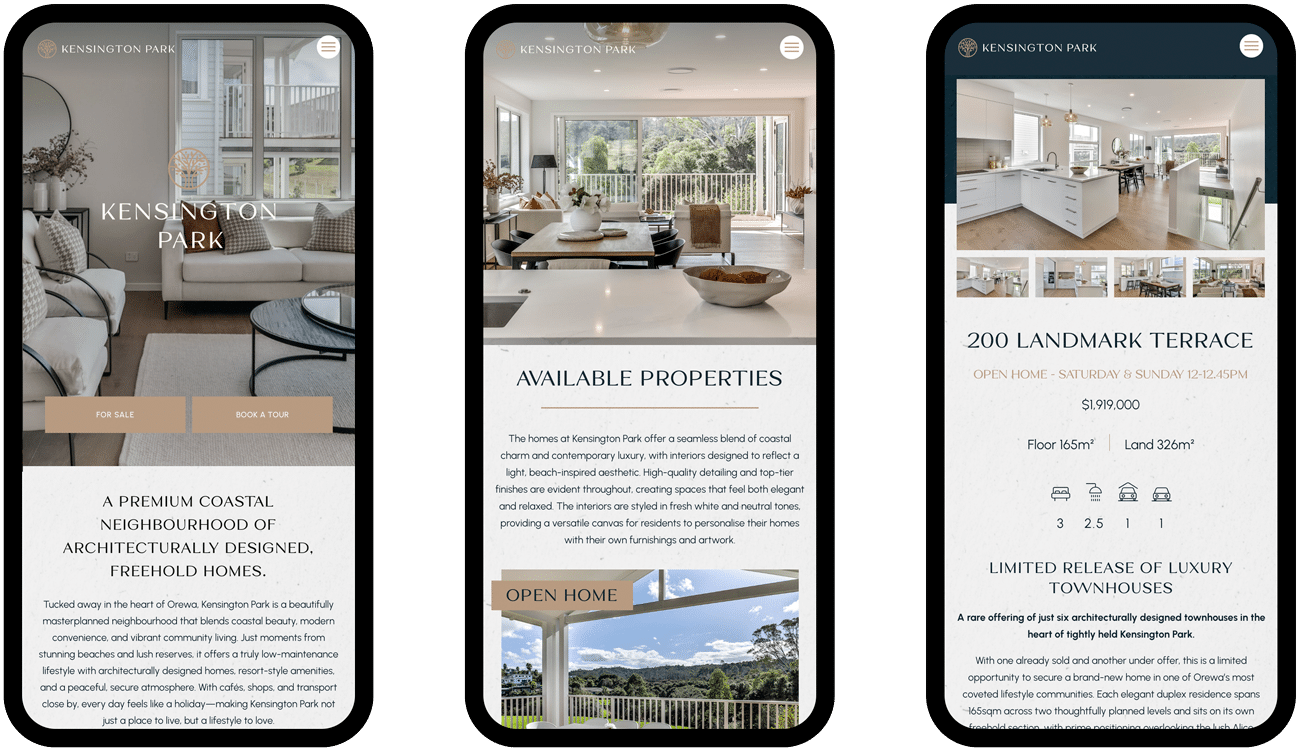 Kensington Park, nestled in the heart of Orewa, New Zealand, is a prestigious residential community known for its stunning homes, lush landscapes, and vibrant lifestyle. When it came to creating a digital presence that truly reflected their brand and connected with their discerning audience, Kensington Park partnered with us for a comprehensive website build.
